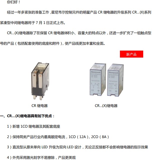經過一年多緊張的準備工作,霍尼韋爾控制元件的明星產品CR繼電器的升級系列CR...(X)系列緊湊型中間繼電器將于7月1日正式上市。
