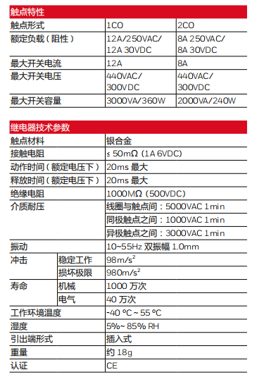 繼電器技術參數